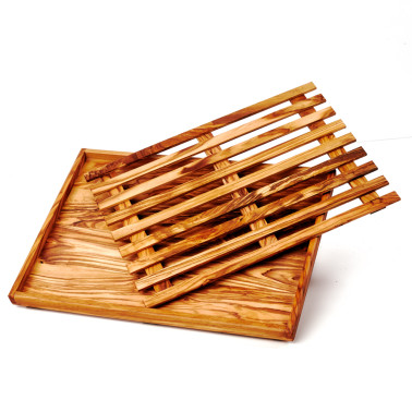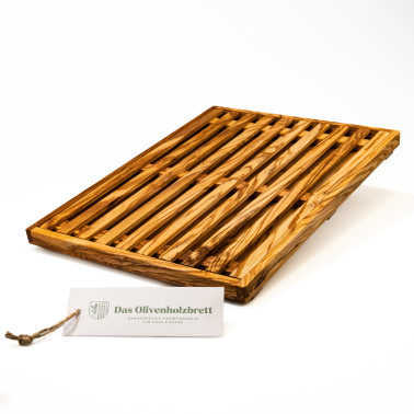 Nie wieder Krümel in der Küche! Dank des praktischen Krümelfachs in ihrem Brotschneidebrett: So schneiden Sie auch das knusprigste Brot ruckzuck – und schon können Sie lecker vespern, was das Zeug hält. Das Brotschneidebrett aus Olivenholz ist besonders flach: so glänzt Ihre Brotzeit mit schlichter Eleganz. Mit dem Olivenholzbrett halten Sie ein wunderschönes, langlebiges Naturprodukt in den Händen – ein absolutes Unikat. Ihr Schneidebrett ist zu 100% handgefertigt und zu 100% natürlich. Das Brett ist in 3 Größen erhältlich. Natürlich ist das Brotbrett auch ein stilsicheres Hochzeitsgeschenk für Trendbewusste.