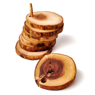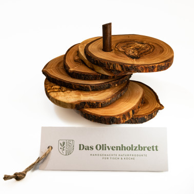 6er Set Untersetzer aus Olivenholz, rund und mit Rindenrand auf Stift