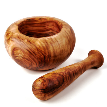 Mörser und Stößel aus Olivenholz, mit rundem Rand