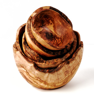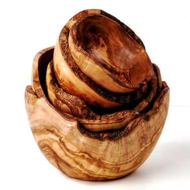 - Rustikal und elegant zugleich: Mit dem einmaligen Naturrand sind Ihre Schalen der Trend in der Küche! Die Olivenholzschalen lassen sich platzsparend ineinander stapeln.